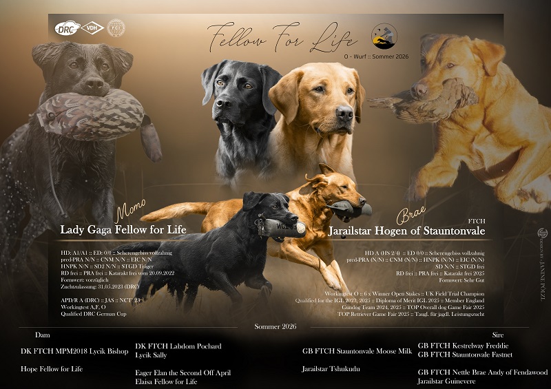 Bei der geplante Verpaarung für unseren O-Wurf (DRC C-Wurf) sind wir absolut sicher, dass der Rüde eine ganz wundervolle Ergänzung zu unserer Lady Gaga Fellow for Life aka Momo sein wird. Somit erwarten wir leichtführige, sehr arbeitsfreudige und gesunde Welpen aus dieser Verpaarung, in den Farben gelb und schwarz.